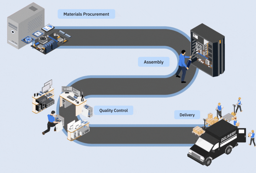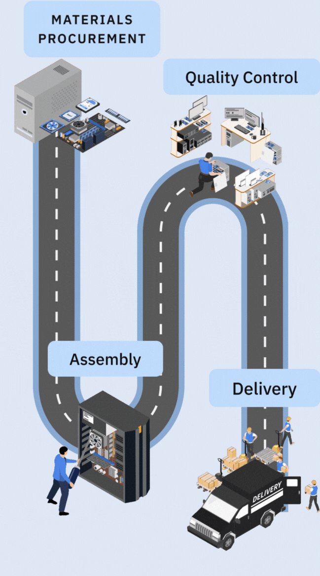 Here are the four stages of our supply chain process beginning with the procurement of raw materials and ending when logistic delivers the final product to the end user.